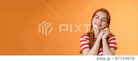 Silly dreamy redhead girl, look hopeful, press palms together lovely near cheek close eyes, daydreaming imaging dad buys new smartphone after graduation, fantasizing, remember good memories
