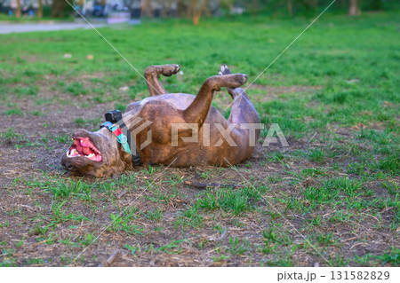 Relaxation and rest. Pitbull lies euphorically on the green grass