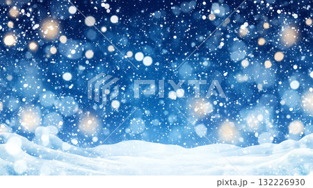 Snowy surface with falling snow and blurred forest in warm sunlight