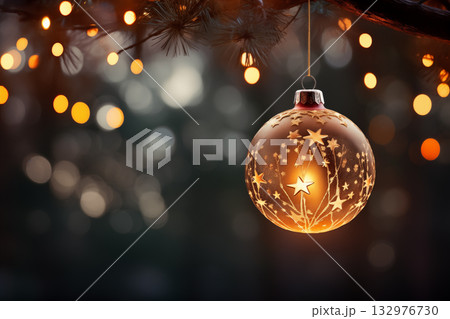 Christmas tree close-up, ornaments and fairy lights glowing softly .