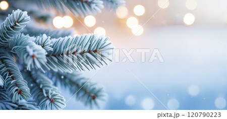 frozen christmas tree branch close up on blurred bokeh background with space for text