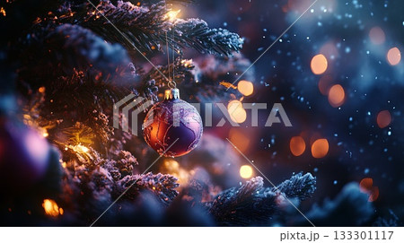 Christmas tree with decorations with toys balls and a garland on a background of bokeh with snow