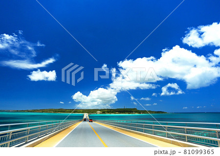 沖縄 島へと続く一本道をドライブ