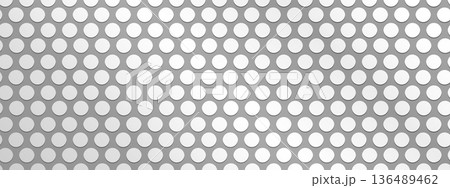 Perforated metallic texture. Steel, chrome or titanium plate, panel, radiator or speaker grill surface with repeated round holes. Shiny material with dotted structure. Vector realistic illustration