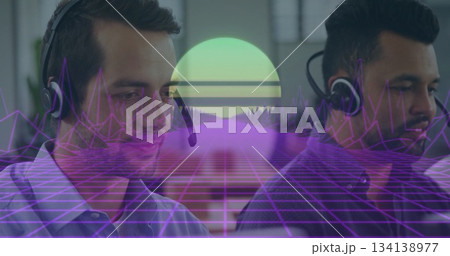 Operating headsets, agents wearing shirts using monitors at office desks, magenta grid, sun graphic