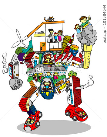 自走するまち・住宅や工場、学校等、まちがロボットとなり自走するイメージイラスト