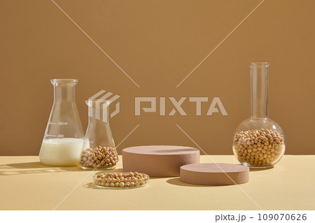 A petri dish and few flasks of soybean seeds and milk decorated on beige background with round podiums. Product presentation, mockup, show cosmetic product
