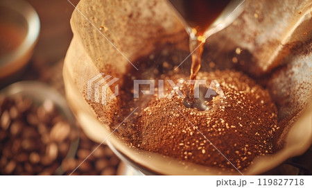 Pouring Hot Water Over Coffee Grounds in a Brewing Cone at a Cozy Kitchen in the Morning
