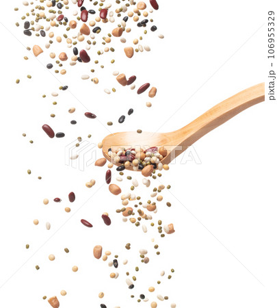 Mix beans fall down explosion, several kind bean float pouring in wooden spoon. Dried white green red soy black peanut mixed beans splash throwing in Air. White background Isolated series two of