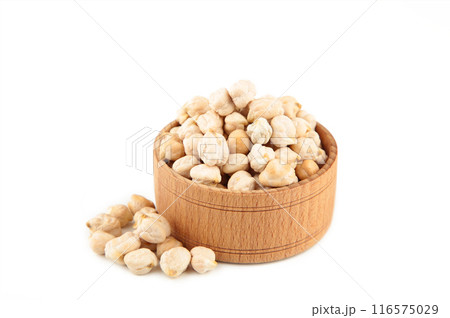 Uncooked dried chickpeas in wooden bowl isolated on white background. Vegan food concept