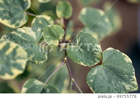 縁が枯れかけている斑入りマルバノキの葉