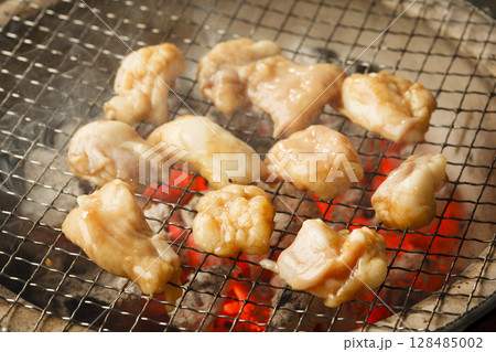 七輪で焼いている丸腸 マルチョウ