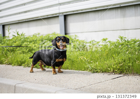 草むらを散歩しながら匂い嗅ぎをしている黒コーギー