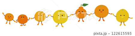 柑橘キャラクター7種類_ちぎり絵_横一列_みかん_伊予柑_はっさく_甘夏_不知火_文旦_河内晩柑