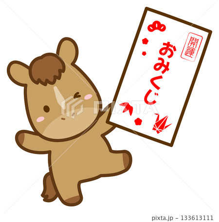 午年のかわいい馬とおみくじのイラストセット 正月 初詣