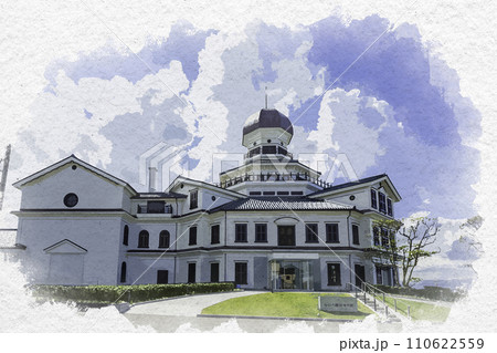 水彩画風 三国湊 坂井市龍翔博物館と三国オーシャンリゾートホテル 福井県坂井市