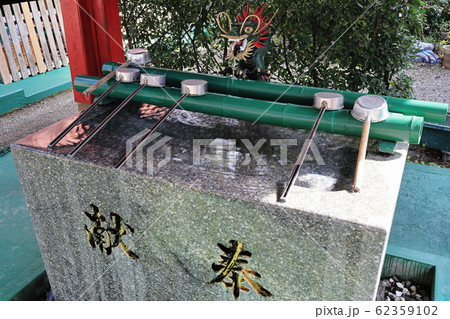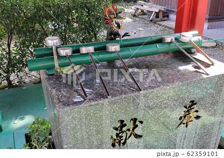 豊玉姫神社 鳥居と手水舎と「水からくり やかた」