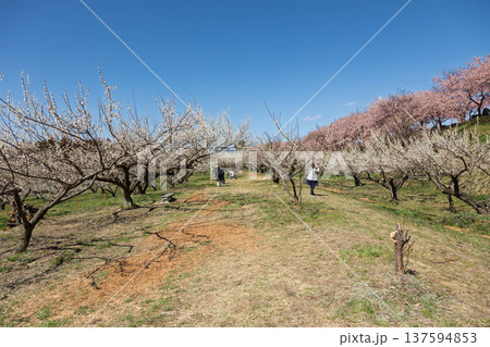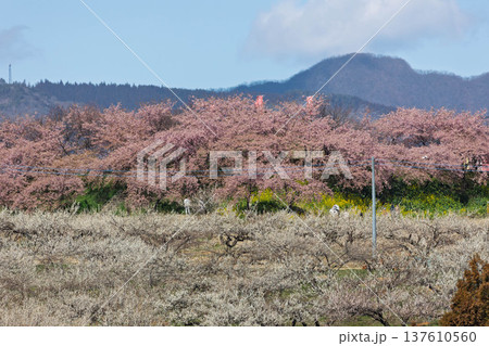 群馬・箕郷梅林の白梅と河津桜