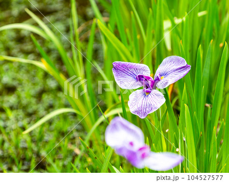 爽やかな初夏の景色 いけのほとりに咲くカラフルで華やかな満開の花菖蒲