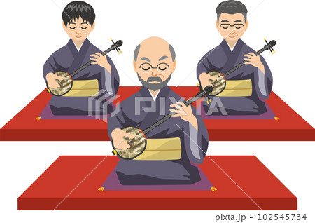 さんしんを座って弾いている男性3人のイメージイラスト(地謡)