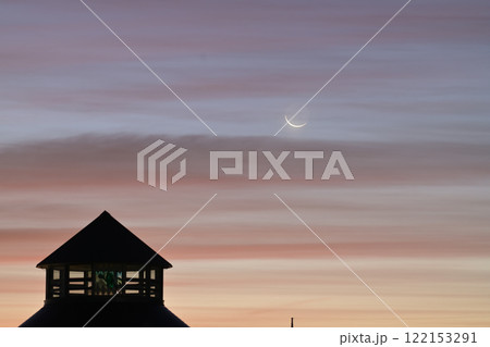 北杜市白州町、神無月末日、東雲の空に昇る月齢28.3の細い三十日月