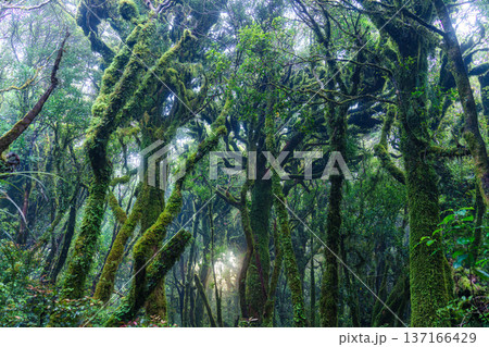 Mysterious lush green moss covered tree in tropical rainforest with sunlight in national park