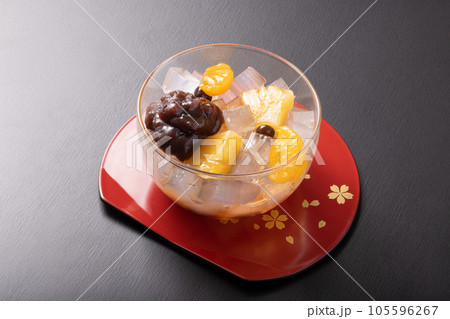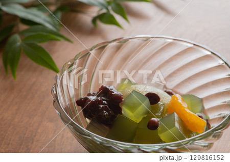 寒天ゼリーとみつ豆、あんことアイスクリームが入った和菓子のあんみつ。