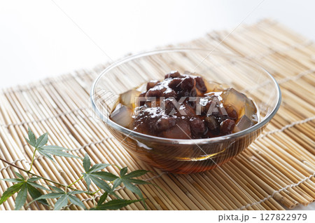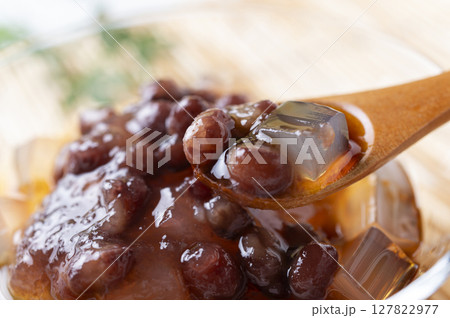 日本の夏のデザート、抹茶あんみつのクローズアップ
