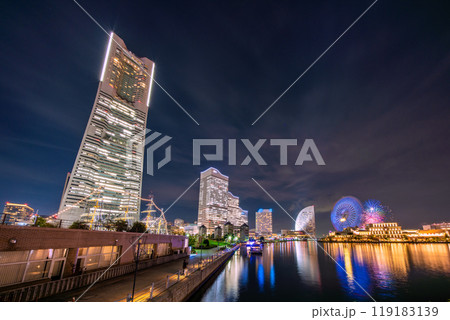 日本の横浜都市景観 2023・「みなとみらいスマートフェスティバル2023」。横浜の夜空を彩る2万発