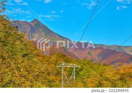 秋の群馬県みなかみ町の湯桧曽川沿いの新道から武能岳方面を見る