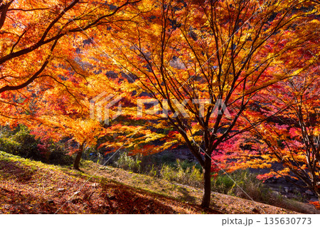 長野県上伊那郡箕輪町東箕輪 紅葉の名所もみじ湖(箕輪ダム)イベント広場付近の鮮やかな逆光のモミジ