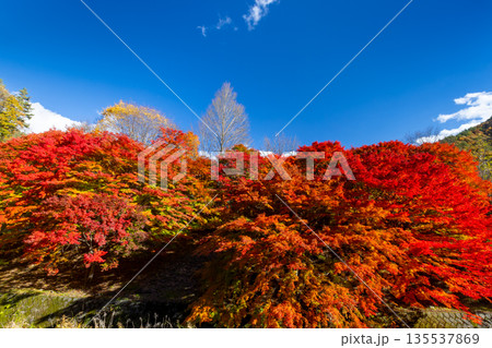 長野県上伊那郡箕輪町東箕輪 紅葉の名所もみじ湖(箕輪ダム)末広広場の鮮やかなモミジと青空