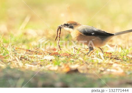 モズのはやにえ用のミミズを咥えるモズ(オス)