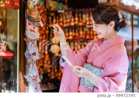 観光地で買い物をする着物姿の女性