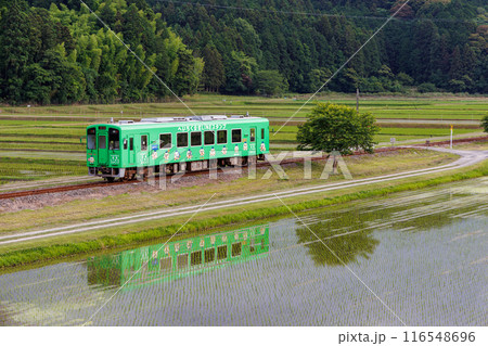 水田の水鏡に映る平成筑豊鉄道500型「黒銀」