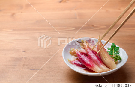 さっぱりして美味しい!みょうがの甘酢漬け(木目背景)
