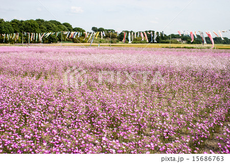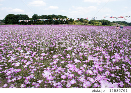 埼玉県鴻巣市滝馬室荒川河川敷ポピーハッピースクエア 満開の見渡す限りのムギナデシコ畑と青空