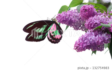 Bright colorful tropical birdwing butterfly on purple lilac flowers. Rothschild's birdwing (Ornithoptera rothschildi) copy space