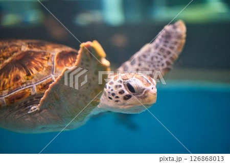 むろと廃校水族館の屋外プール水槽を泳ぐウミガメ