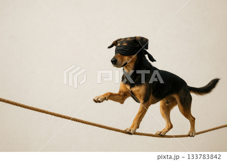 A blindfolded dog walking cautiously on a tightrope. Space for text.