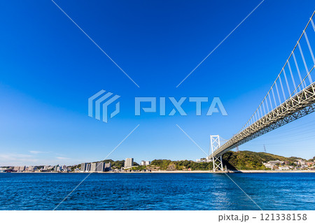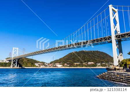 福岡県北九州市門司区の関門海峡に架かる関門橋と門司埼灯台