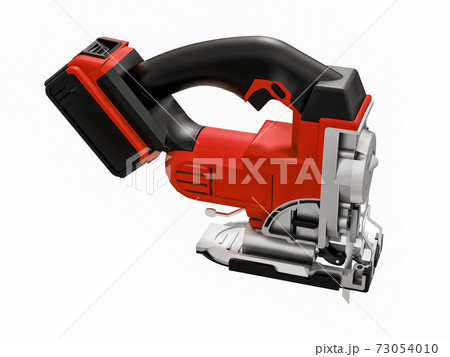 The tool is a red electric jigsaw on a white isolated background. 3d rendering.