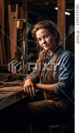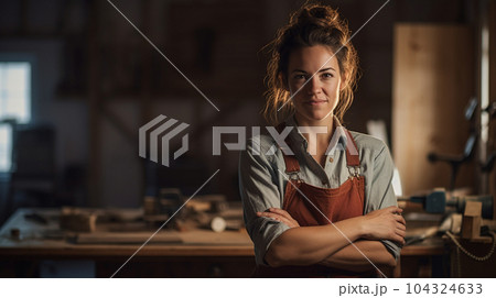 Carpenter lovers stand closely together and look at camera during work in workplace