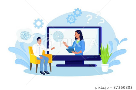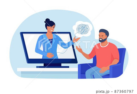 Online psychotherapy. Psychologist doctor helps patient to unravel tangled thoughts. Psychological problems, mental disorder, treatment of stress, addictions. Psychology counseling