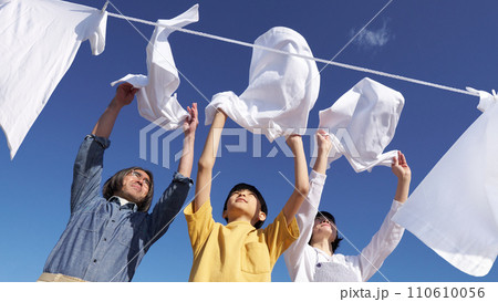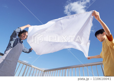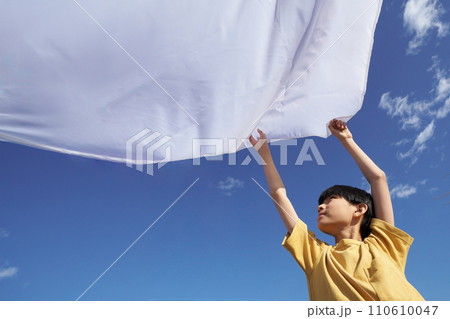 青空のもとで洗濯物のシーツを広げる小学生の男の子