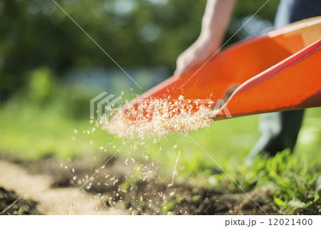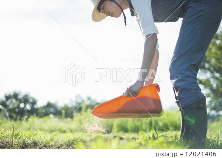 モミガラを蒔く農家の女性