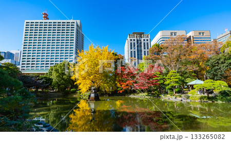 日比谷公園・紅葉の雲形池と高層ビル群の風景(東京都千代田区)