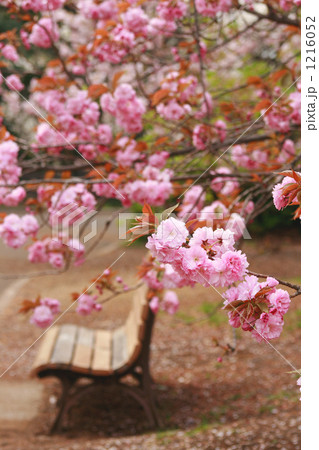 八重桜に囲まれたベンチのある公園