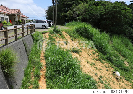 沖縄 名護 名護市立中央図書館と除草作業中のヤギ