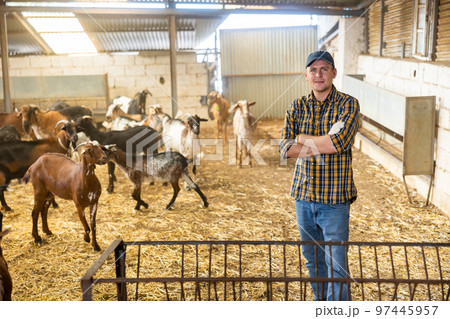 Portrait of successful young man professional goat breeder taking care of goats in barn livestock farm